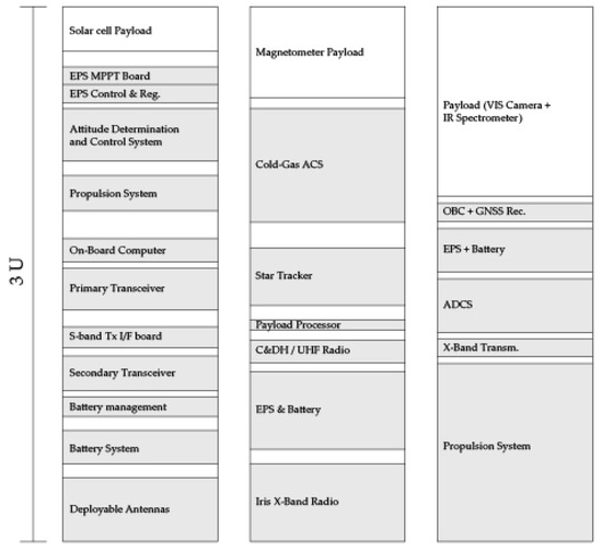 As reported in Reference [25], the physical architecture of a satellite can be defined as the foundation on which all its functions and performance is built upon. So it comprises the satellite breakdown in physical subsystems and components, their location, and their structural and electrical interfaces. The majority of CubeSat architectures is based on modular stack of printed circuit boards (PCBs), and each of the subsystems is represented by one (or more) PCBs. Beside the classical approach, innovative architectural concepts have been proposed through the years: cellular, panel, plug-and-play, and lean electrical interfaces.