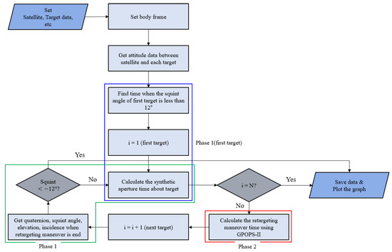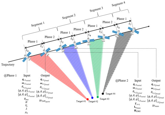 In this study, as shown in Figure 1, we analyze the optimal control characteristics of the imaging maneuver (Phase 1) and the retargeting maneuver (Phase 2) required for continuous imaging. Phase 1 is a stage in which an image of a target is taken while minimizing the Doppler centroid variation, and an attitude maneuver for imaging is performed at the same time. Phase 2 refers to the section in which a retargeting maneuver is performed to image the next target and includes stabilization time.