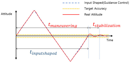The modal frequency and mode gain of the flexible structure were assumed to consider the stabilization time. Based on the pointing accuracy and pointing stability, the appropriate jerk is analytically selected so that there is no need for stabilization time due to the flexible structure. In other words, a suitable jerk is selected to be from the mechanical aspect. Each time element for stabilization, maneuvering, and input-shaped is defined as shown in Figure 2.