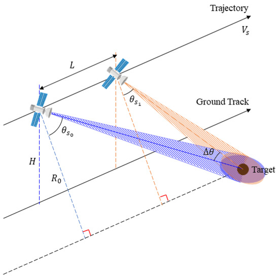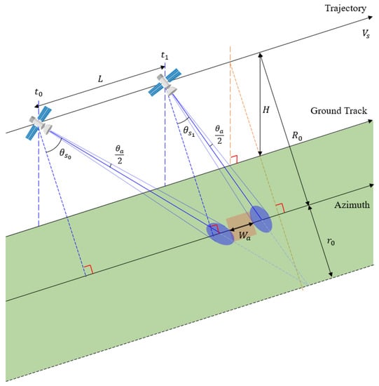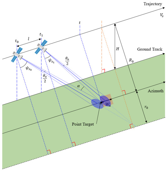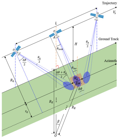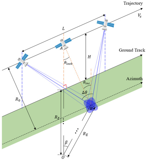 Figure 3 shows illuminated geometry at the broadside staring spotlight mode. In Figure 3, and are the incidence angle and slant range at the aperture center, respectively. is the look angle, and are the synthetic aperture angle (SAA) and the synthetic aperture length (SAL), respectively. is the velocity of the satellite, is the radius of the Earth, point is the center of (the) Earth. As shown in Figure 3, when assuming the Earth is flat, and become the same.