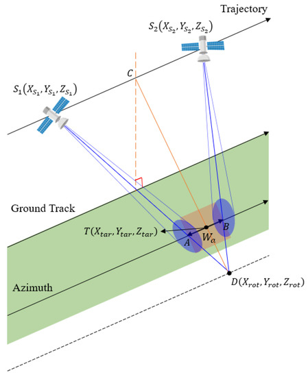 As described above, in the sliding spotlight mode, the imaging center is located below the surface and the area above the surface is imaged. Figure 6 shows the geometry of the SAR satellite in broadside sliding spotlight mode for the point targets in the target scene to be imaged.