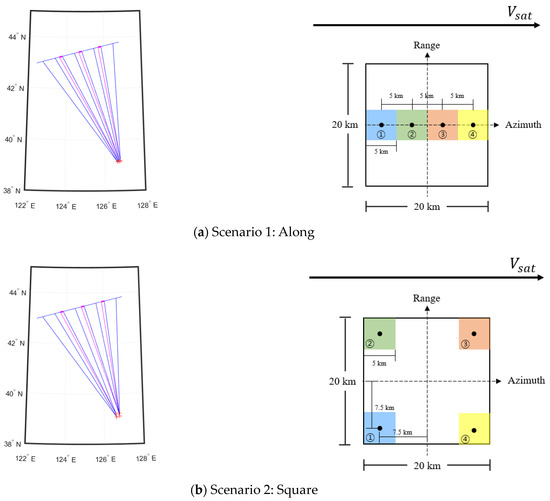 Imaging is performed through pitch maneuvers, but due to the influence of the Earth’s rotation, roll and yaw maneuvers must also be considered. In this analysis, a margin of 25% is considered in addition to the staring spotlight mode SAT obtained from Equations (7) or (11).