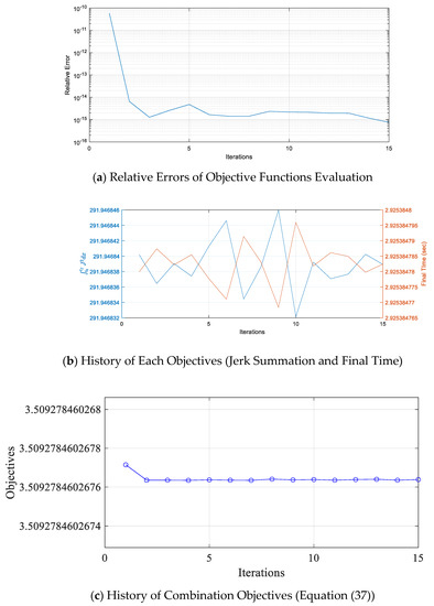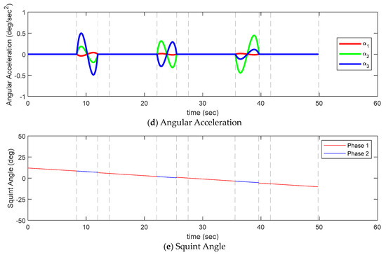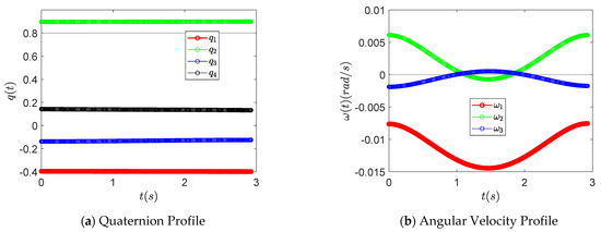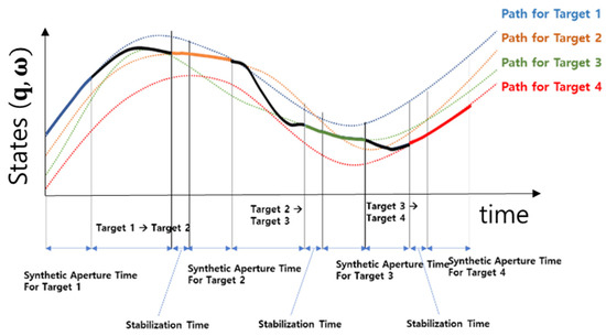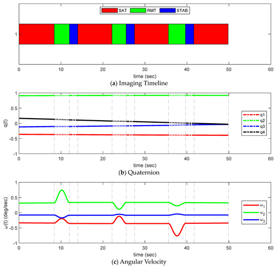 In this analysis, it is assumed that when the satellite enters the communication area, it maneuvers to point at the first target through the squint maneuver. During imaging (Phase 1), through the position, velocity, and initial angular velocity of the satellite in the ECEF coordinate system and the attitude of the satellite that minimizes the Doppler centroid variation, it can be expressed kinematically using quaternion. In addition, the angular velocity of the satellite can be obtained from the equation of the quaternion’s kinematics [17]. The angular velocity of the satellite is that for the three principal axes of the satellite body frame. The quaternion and the angular velocity of the satellite at the end of imaging are used as input data for optimization in the next Phase 2 retargeting maneuver section.