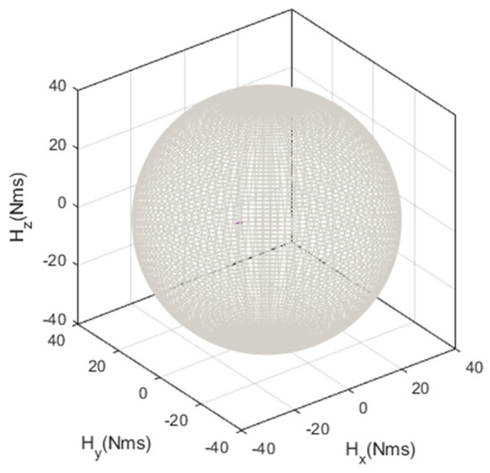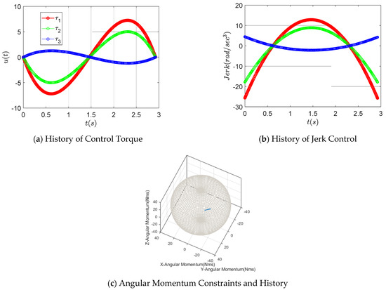 In Equation (30), is the torque received from the satellite, is the spacecraft’s inertia matrix, and is the angular velocity. To solve the maneuvering problem, the torque and angular momentum limit conditions that can occur in the actuator are considered. In this study, the analysis is performed by considering only the actuator torque, excluding external torques, such as gravity and drag. Torque is defined as . It is assumed that there exists only MoI without PoI (product of inertia). Therefore, , and if and are expressed, Equation (30) can be summarized as Equation (31).