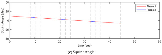 When imaging continuous targets, the first target can set the maximum squint angle at the start of imaging that can be provided in the satellite design, and can be calculated from Equation (8). Since the squint angle is the angle between the satellite and the target when the retargeting maneuver ends in Phase 2 of the previous segment from imaging of the second target, the squint angle at the start of imaging is calculated from Equation (9). The squint angle at the ended imaging can be obtained by substituting this angle into Equation (8).