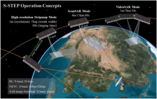 The S-STEP program has been started to develop an 80 kg class lightweight small SAR satellite for high-resolution SAR imagery for environmental investigation, surface mapping, and disaster monitoring. The mission operation concept of the S-STEP system is shown in Figure 1 [22]. The S-STEP system is operated at LEO and provides a 1 m resolution stripmap image, 4 m resolution ScanSAR image, and 1 m resolution VideoSAR for 10 s duration to capture the earth’s targets of interest. The SAR payload of S-STEP is an aperture-coupled cavity-backed microstrip patch array antenna, which can achieve high radio frequency (RF) gain. A total of 192 TRMs were applied to implement electronic beam steering capability in the elevation direction of the antenna. The SAR image data are transferred to an integrated avionics unit (IAU) for storage. The stored data are transmitted to the ground station through a 1 Gbps X-band downlink module. The expected mission lifetime of the S-STEP system is 3 years. The S-STEP program ultimately aims to implement a satellite constellation for near real-time SAR observation. Therefore, the S-band inter-satellite link (ISL) system is considered for immediate communication link between the satellites. Table 1 lists the basic system specifications of S-STEP [22].