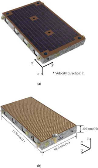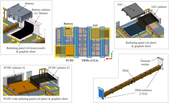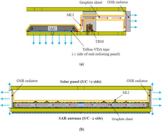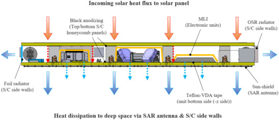 Proper thermal control is crucial to guarantee the functionality and thermo-mechanical stability of an SAR satellite with many high-power instruments in extreme on-orbit thermal environments. Traditionally, most SAR satellites have adopted flexible deployable SAR antenna panel structures [12] to achieve the desired SAR imaging performance. Thermal designs for SAR satellites have been mostly based on passive thermal control approaches using suitable thermal coatings, paints, thermal fillers, thermal insulators, radiators, multilayer insulation (MLI), and sun-shield. In addition, heat pipes and doublers have been applied to the radiator for effective heat dissipation of some high-power instruments, such as transmit/receive modules (TRMs) and electronics. The heat loss through the radiator was compensated by a heater. To date, several studies [13,14,15] have proposed and investigated the thermal design for SAR satellites based on thermal control hardware.