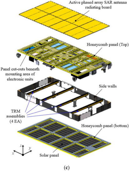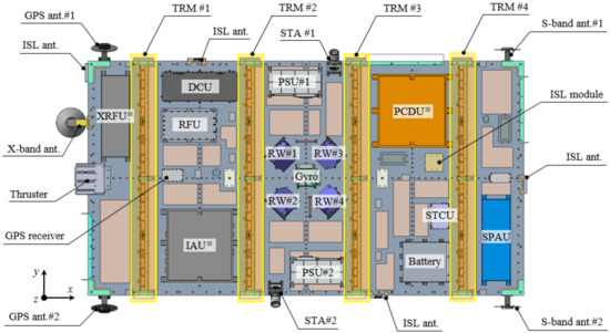 Figure 2 shows the mechanical configurations of the S-STEP satellite. The primary feature of its mechanical design is the bus–payload integrated flat panel-shaped satellite structure. This mechanical configuration is advantageous to ensuring the dimensional stability of the satellite, especially the SAR antenna, in extreme on-orbit thermal environments. One more essential feature of this satellite configuration is the additional 0 g compensation device for on-ground testing of SAR antennas, as it is a nondeployable-type antenna. All payload and bus electronic units are mounted on the top aluminum-skin honeycomb composite panel as the configuration shows in Figure 2c and Figure 3. Four reaction wheels (RWs) in a pyramidal configuration with an optimal tilt angle are mounted at the center of the satellite to minimize the moment of inertia and their power consumption. The X-band antenna for payload data downlink and two S-band antennas for telecommand/telemetry (TM/TC) communication are installed on the side walls in −x, +y, and −y sides of the satellite. The GPS and ISL antennas are also installed on various locations of the side walls. To operate the satellite, 340 W of electrical power is produced at beginning of life (BoL) and stores the power in the battery with 648 Wh capacity. Among the on-board instruments of satellite, the four TRM assemblies require the largest amount of power consumption. In the SAR imaging operation, the stored battery power is mainly used to operate these TRM assemblies.