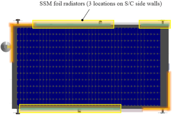 In the thermal design, an RF-transparent sunshield covers the external side of the SAR antenna for heat rejection. The primary satellite structures of aluminum-skin honeycomb panels are black anodized for minimizing the thermal gradient over the entire satellite structure by facilitating the internal heat exchange. The internal waste heats of payload and bus electronic units and solar panels are dissipated via mounting surfaces (−z side) to the SAR antenna. Thus, most honeycomb panel areas, including the mounting areas for electronic units, were cut-out for their effective heat dissipation (Figure 2c). These cut-outs were advantageous to reduce the satellite mass as well. The electronic unit mounting surfaces (+z side) were coated with Teflon-VDA tape with high emissivity. The rest of their surfaces were covered with MLI to avoid the absorption of heat radiated from the solar panel. For further heat dissipation, second surface mirror (SSM) foil radiators were integrated on the sidewalls (Figure 5).