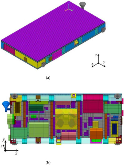 Thermal mathematical model (TMM) of S-STEP satellite: (a) view from +z side and (b) internal configuration.