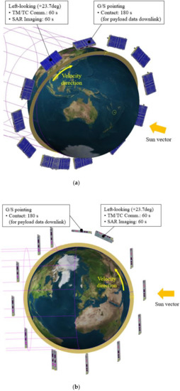 The so-called NewSpace paradigm refers to the recent commercialization of the space sector. The technology innovations of satellite and launch vehicles, as well as various relevant services, are now leading the rapid advances and growth of global space industries [1]. One of the technologies that plays an important role in the NewSpace era is the emergence of a small satellite constellation. The constellation of multiple satellites effectively reduces the system’s temporal performances, such as revisit and response time, which enables frequent access to the target. The smaller, lighter, faster, better, and cheaper small satellite platform realized a large-scale constellation in orbit based on satellite mass production, which was nearly impossible with large-scale satellites [2]. The reduction of satellite launch cost, via reusable launch vehicles, small-scale launchers, and air-launch-to-orbit, have increased the satellite launch capability, thus contributing to the rapid orbital insertion of small satellites. These advantages make the small satellite platform attractive for implementing various low earth orbit (LEO) constellation missions, such as near real-time earth observation, global internet services, and communication networks, for commercial and military purposes [3,4,5].