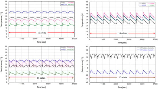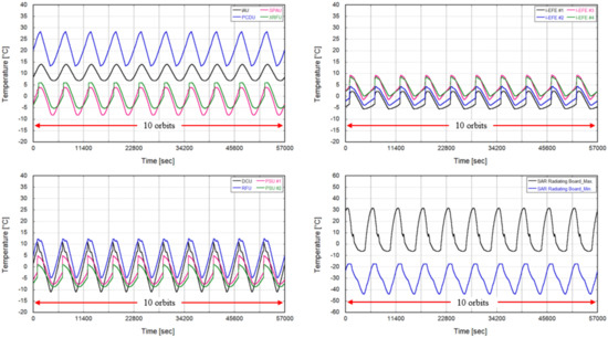 Figure 10 shows the representative thermal analysis results for Case 1—the orbital temperature profiles of components newly developed in this program when the left-looking SAR imaging operation was executed in the hot environment. This is the worst hot condition for the S-STEP system among the analysis cases listed in Table 5. Temporal temperature variations occurred due to the changes in incidence angle of satellite with respect to the sun and earth in accordance with the orbital revolution of satellite, as shown in Figure 9. The thermal design to dissipate the heat of electronic units through SAR antenna controlled their temperatures well, especially high-power electronic units, such as PCDU, IAU, and battery, combined with sidewall radiators and thermal paths implemented by the graphite sheet. The key payload components of TRM assemblies were operated under a moderate temperature condition, ranging from 29.6 to 42.2 °C, despite their total heat dissipation of 1460 W (365 W per a single TRM assembly) during SAR imaging operation. Figure 11a,b, respectively, show the predicted maximum and minimum temperatures of all onboard components in Case 1 (left-looking) and Case 2 (right-looking) when the SAR imaging operation is executed in the hot environment. The graph also shows the operating and survival temperature limits of each component. In both cases, the temperatures of all components were maintained within their allowable limits for the operating conditions specified in Table 2. In particular, the high-power components of IAU and PCDU were operated with sufficient temperature margins of more than 6.7 °C by effective heat dissipation via the SAR antenna and sidewall radiators. The battery temperature was maintained above 25.3 °C, and the heater was not operated during the entire orbit. These analysis results indicated that the proposed thermal design strategies were effective for stable satellite operation and achieving the required SAR imaging duration of 60 s, regardless of SAR left- and right-looking modes, even in the worst hot environment.