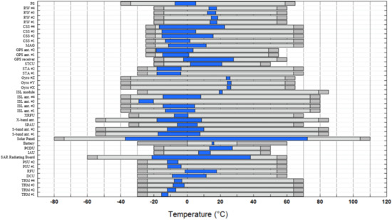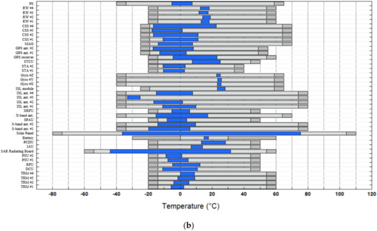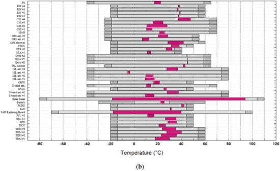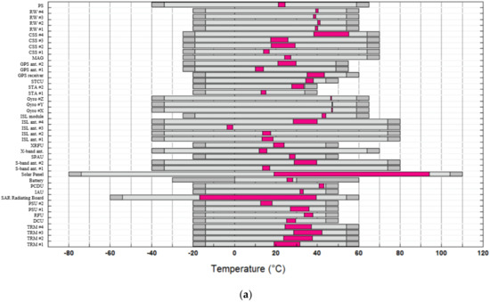 Figure 12 shows Case 3 analysis results—the orbital temperature profiles of representative onboard components when left-looking SAR imaging operation is executed in the cold environment. The predicted maximum and minimum temperatures of the entire onboard components in Case 3 (left-looking) and Case 4 (right-looking) when the SAR imaging operation was executed in the cold environment are shown in Figure 13a,b, respectively. These figures show that all components were within the temperature ranges of operating conditions. The temperatures of TRMs were moderately maintained within the range of −5.6 to 0 °C in both the left- and right-looking modes of SAR antenna. The battery temperature was maintained above 14 °C by heater control, and the duty was 36%. Figure 14 shows the thermal analysis results in Case 5 (safe-hold mode, cold environment). All non-operating components kept the temperature within the survival limits. The heater duty was 39% in this case. These on-orbit thermal analysis results showed that the proposed S-STEP system would be stably operated throughout the mission duration under the expected on-orbit thermal environment.