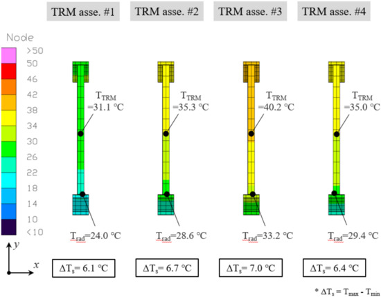 The TRM exhibits temperature-dependent RF output characteristics, such as gain and phase errors, which negatively affect in-antenna beam formation [28]. Although the S-STEP SAR payload has an output error compensation function, an additional technique to contribute to the error compensation, in the thermal control perspective, might be to reduce the spatial temperature difference (ΔTs) over the TRM assemblies. Figure 15 shows the analyzed temperature contour of four TRM assemblies at the time when the maximum ΔTs occurred during the left-looking SAR imaging in the hot case. Table 8 summarizes ΔTs of each TRM in the left- and right-looking modes in the hot and cold environments (Cases 1–4). The ΔTs values of TRMs did not increase more than 7.6 °C in all cases.
