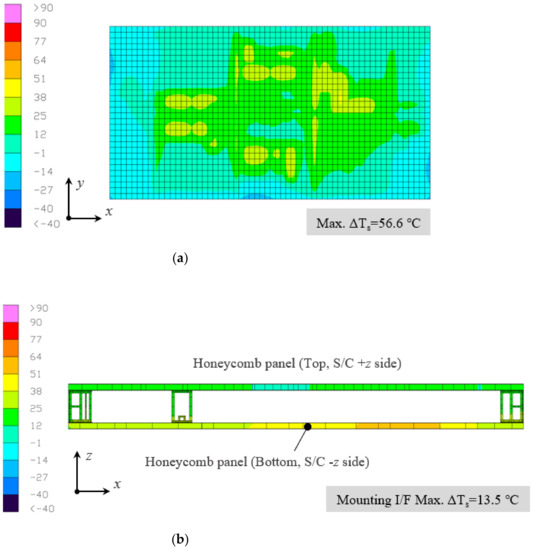 In this study, we also analyzed ΔTs over the SAR radiating board and satellite primary structure because they are important in assuring the image quality of SAR antenna against the dimensional instability due to thermal distortion. Figure 16a,b, respectively, show the representative temperature contours of SAR radiating board and satellite platform structure in the left-looking SAR imaging operation in the hot environment in which the ΔTs values are 56.6 and 13.5 °C. The antenna root–mean–square (RMS) surface error and antenna best-fit plane (ABFP) angle estimated in the previous study [22], based on those thermal analysis results, were 0.7 mmrms and 0.005°, respectively. These values were sufficiently low to comply with the S-STEP SAR antenna requirements (RMS error of <1.55 mmrms and ABFP angle of <0.02°).