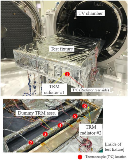 The specimen was exposed to the thermal environment of −70 °C controlled by a chamber shroud. The operating temperature of the radiators was maintained to 20 °C by the heater control to simulate on-orbit temperature conditions. The temperature reference point was located near the center of TRM to declare thermal stabilization, as when the temperature variation is less than 2 °C/h. The TV test was performed under a pressure level of 10−5 torr. In the test, the ΔTs between the center of the TRM and radiator was the main factor to judge the effectiveness of the proposed thermal design.