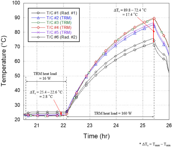 Figure 18 shows the temperature profile obtained by thermocouples when the specimen was thermally stabilized. In the thermal analysis, the orbital average heat dissipation of TRM assembly was approximately 4 W because it was operated for only 60 s during SAR imaging, although its power dissipation was 365 W. In the test, the constant heat load of 16 W was first applied to the TRM, which was a sufficiently high amount of heat load to simulate the orbital average heat dissipation. The TRM reached 25.4 °C, and the maximum ΔTs between the TRM and radiator was 2.8 °C. Meanwhile, the thermal analysis results shown in Figure 15 indicated that the maximum ΔTs value of TRM assemblies #1–#4 was 7.0 °C when the radiator temperatures were ranging from 24.0 to 29.4 °C. Table 8 also shows that ΔTs was less than 7.6 °C in all cases of SAR imaging operations. The thermal conductance value between the TRM and radiator, simply estimated from the heat load and ΔTs observed from the test, was 5.7 W/K. Subsequently, the heat load of 160 W was applied to the TRM to observe further heat dissipation capability. The increase in TRM temperature was only less than 1 °C after 60 s, and the temperature was stabilized at 89.8 °C. The ΔTs at the stabilized temperature was 17.4 °C. The thermal conductance value between the TRM and radiator in this condition increased to 9.2 W/K as the radiated heat energy increases at higher radiator temperature. These test results indicated that the proposed radiator design had sufficient heat dissipation capability for thermal control of TRM assembly in on-orbit SAR imaging operation conditions.