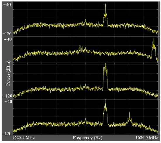 Figure 2, one can observe a different downlink burst from iridium-Next LEO satellites during experimental measures. This experience could also be repeated for Orbcomm, Globalstar, and other VHF/UHF and L-Band LEO satellites. The goal was to observe Doppler shifts and to measure accurately the Doppler frequencies before calculating related pseudorange rates equivalent to the respective measures. It is important to pay attention to the clock bias and the clock drift on the SDR side because they have a direct impact on the estimation accuracy as well as the alignment quality. Although the kinematic and clock states of each observed satellite could be included in the EKF system, our concentration in this study was on deriving the accurate estimation of the receiver’s states. The measurement model for the slave EKF system was defined as Equation (14), where