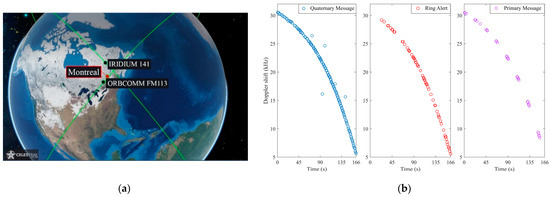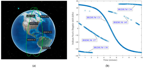 Usually, LEO satellites use quadrature phase shift keying (QPSK) or code-division multiple access (CDMA) downlink signals, which can be of two main types: continuous (such as Orbcomm and Globalstar) and burst-based (such as Iridium, etc.). In this study, we concentrated on two outstanding constellations, namely, Orbcomm and Iridium-NEXT. The orbital data of each satellite in all three constellations were updated every day in a TLE file, which is freely downloadable from the North American Aerospace Defense Command (NORAD) website. The data are represented with one of the simplified perturbations models such as SGP, SGP4, and SGP8.