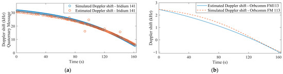 could then be derived and estimated using least-squares algorithms applied on the phase parameter estimation of LEO signals. In this work, the Orbcomm and the Iridium-Next downlinks were considered as a LEO-SOP source. Thus, pseudorange rate measurement was possible to obtain following Equation (13). The pseudorange rate measurement for the