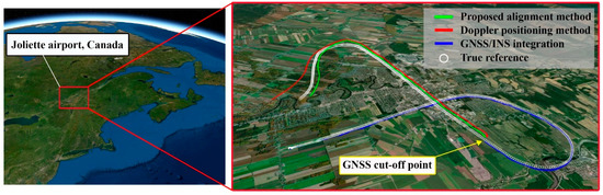 Two experiments were planned to examine the proposed method. The receiver, antenna, front-ends, IMU, and other equipment were installed one time on the ground and the next time on a flight vehicle. A special 2-min trajectory for the ground experiment and a 10-min air path for the flight test were selected. The final accuracy of the ground test reached 12.234 m, which showed a significant improvement compared to the stand-alone INS. The results of the flight test were demonstrated in different time periods. It helped us to track the accuracy of the proposed method by time. It could also measure the robustness of each algorithm. The accuracy of the alignment method in the first 150 s increased by around 60% compared to the Doppler positioning method. The method showed a RMSE of around 197 m, which advanced around 180% for the entire trajectory.