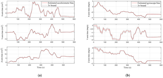 , are estimated from the alignment system. First, the IMU data were calibrated using the estimated biases. Equations (1) and (2) show the IMU data after performing the correction.