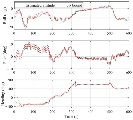 After defining the EKF measurement and the state-space model, the prediction and update processes were required to estimate the receiver’s states. First, the attitude, position, and velocity of the receiver were predicted using the kinematic INS equations, which were discussed previously. Additionally, the clock states of the receiver were predicted using the receiver’s clock bias state-space model. The predicted covariance matrix was obtained by Equation (20).