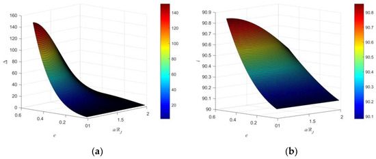 Figure 1a illustrates the relation between a, e and the discriminant. Here we set semimajor axis a to change from RJ to 2RJ and e from 0 to 1 − RJ/a. From Figure 1a, one can see that the discriminant is always above zero, so Equation (5) has one real root all the time. In other words, it is evident that there usually only exists one sun-synchronous orbit at a certain semimajor axis with normal eccentricity. Figure 1b shows the variations of inclination i with respect to a and e. As one can see from Figure 1b that the inclination is always greater than 90 degrees, the sun-synchronous orbits of Jupiter must be retro-orbits.