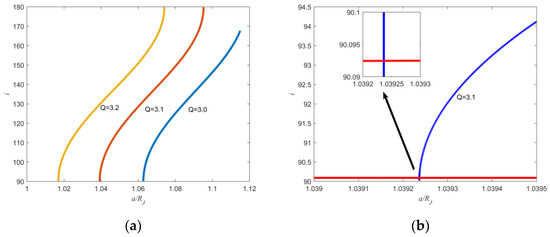 As we note that is the cubic function of , Equation (5) probably has one, two, or three distinct roots in the interval. It is necessary to judge whether all roots of Equation (5) are meaningful for different semimajor axes. Based on the theory of the cubic equation, Equation (5) has three real roots if the discriminant satisfies the condition