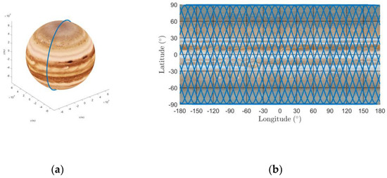 Figure 3a represents the sun-synchronous repeating ground track orbit of Jupiter during one period in a 3D view. The elements of the spacecraft’s orbit are a = 1.03924 RJ, e = 0.001, i = 90.0925 deg, deg, deg. The repeating parameter Q = 3.1 means that the spacecraft rotates around the Jupiter’s surface 31 revs in 10 Jupiter days. Figure 3b shows that during 10 Jupiter days, the ground tracks just close up with the starting point.