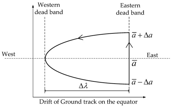 In Equation (28) the unit of t is rad/D, rather than rad/s. It can be seen that Equation (28) is a quadratic equation about time variable t. As it is known that , a conclusion is that if , will monotonically increase with time from Equation (28). As a result, the ground track drifts towards the east. However, if we execute a control maneuver to make at this moment, the ground track will drift towards the west. From Equation (28), the derivative of is