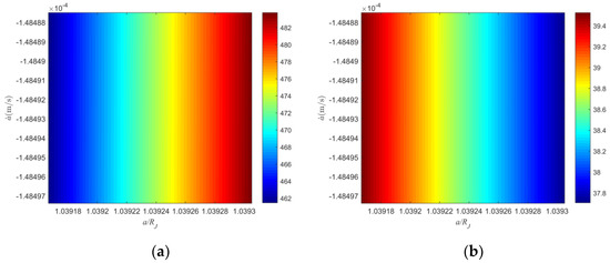 We limit the ground track drift to the nominal definition less than 50 km over the Jupiter equator. This means that the angle drift is about 0.04 deg, which is really a small and permissible angle error for Jupiter spacecraft observation. We assume that the spacecraft’s area-mass ratio S/m in Equation (23) is 0.02 m2/kg, and drag coefficient Cd is 2.2. As it has been calculated in the previous chapter, the semimajor axis is 1.03924 RJ, in other words, about 2805 km above Jupiter’s surface. Considering the initial error of semimajor axis when the spacecraft enters the Jupiter’s surrounding orbit, we select the spacecraft’s height from 2800 km to 2810 km above Jupiter’s surface. As we do not know the exact relationship between the atmospheric density and the spacecraft’s height, we just give the corresponding density range as described in [35,36]. Figure 5a illustrates that the control impulse varies with semimajor axis and the derivative of the semimajor axis. The corresponding is calculated using Equation (23). Figure 5b shows the control frequency varies with a and . From Figure 5a,b, an immediate conclusion can be obtained that the semimajor axis should be compensated about 462 to 482 m every 37.8 to 39.4 days under the effect of the atmospheric drag to keep the orbit’s repeatability. It can be found in Figure 5a that the compensation of semimajor axis increases with a on the x-axis. According to Figure 5b, the control frequency obtains the opposite results. On the y-axis, the compensation does not change obviously. These indicate that the effect of a changing semimajor axis dominates the result with respect to the changing density.