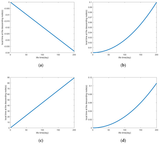 (a) Drift of local time at the descending node caused by initial semimajor axis error; (b) drift of local time at the descending node caused by atmospheric drag; (c) drift of local time at the descending node caused by initial inclination error; (d) drift of local time at the descending node caused by the sun’s gravity.