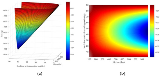 In Figure 8, the color bar expresses the prebias of the inclination needed. As the local time at the descending node equals and has a term, the maximum value occurs at the local time at the descending node 45 deg. As Equation (40) works on all sun-synchronous orbits, we can set the descending node 45 deg if we want a tiny prebias of inclination. It can be seen that the prebias of inclination is monotonically decreasing over the spacecraft’s lifetime. It means that we need more prebias if we want the spacecraft to last.