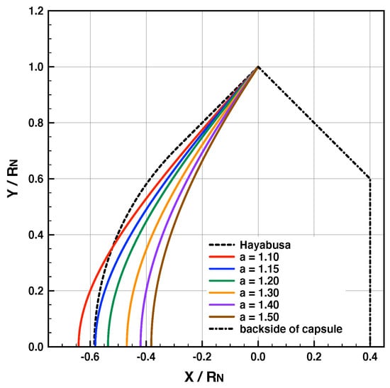 becomes the effective nose radius of the designed capsule. When , is 1.0, which is equal to the base radius. This relationship between the base radius and the nose radius is the same as that of the Hayabusa capsule. Figure 1 shows the contour of the designed capsule using Equation (2) when a is varied from 1.1 to 1.5. The contour of the Hayabusa capsule is also shown in the same figure for comparison. In this figure, all the dimensions are normalized by the nose radius of the Hayabusa capsule, , 200 mm. As can be seen, when a is around 1.15, the designed capsule has almost the same dimensions as the Hayabusa capsule. The same contour was set for all the shapes behind the shoulder of the capsule. In other words, only the shape of the forebody of the capsule was modified.