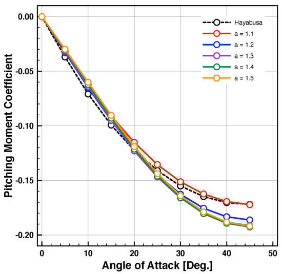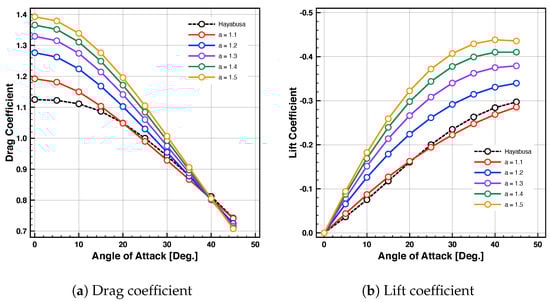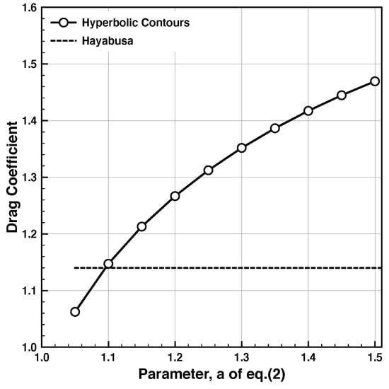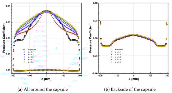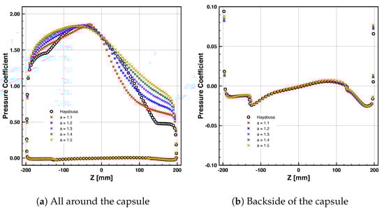 Figure 6 shows the pressure coefficient distribution around the re-entry capsules with hyperbolic contours on the symmetry plane. Figure 6a,b show the distribution all around the capsule and the distribution on the backside of the capsule, respectively. The angle of attack (AoA) is set to 0 degrees. From Figure 6a, it can be observed that when the parameter a of Equation (2) is 1.1 the pressure coefficient near the stagnation region is smaller than that of the Hayabusa capsule but near the shoulder region the pressure coefficient of hyperbolic contours is larger than that of the Hayabusa capsule. When the parameter a is 1.2, the pressure coefficient near the stagnation region is almost the same as that of the Hayabusa capsule. As the parameter a becomes large the pressure coefficient on the forebody of the capsule becomes large. These results suggest that as the parameter a becomes large the drag coefficient becomes large at AoA of 0 degrees. From Figure 6b, it can be observed that regardless of the parameter a the pressure coefficient distributions for all cases are almost the same. These results suggest that the parameter a does not affect the pressure distribution on the backside of the capsule significantly.