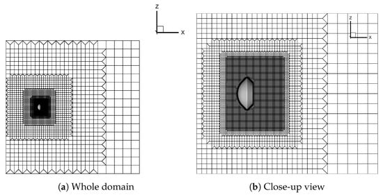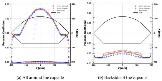 Figure 4 shows the computational grid around the capsule on the symmetry plane. Figure 4a,b show the whole computational domain and the close-up view, respectively. The length of each element near the capsule is set to be 10 mm. The minimum length of the computational grid on the body surface is set to be 0.1 mm to detect the boundary layer flow properties. The total number of cells, faces, and nodes of this computational grid are 963,596, 2,748,156, and 806,003, respectively. The effect of the grid resolution on the computational results is discussed in the next section.