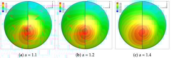 Figure 8 shows the pressure coefficient distribution on the forebody of the re-entry capsules with hyperbolic contours at AoA of 15 degrees. For comparison, that of the Hayabusa capsule is also shown on the right half of each figure. From Figure 8a–c, it can be observed that the stagnation point shifted downward and as the parameter a increased, the high-pressure region was enlarged not only on the symmetry line but also on the whole region of the forebody of the capsule. These results suggest that the shape of the forebody of the capsule with hyperbolic contours will help to enhance the drag force of the capsule.
