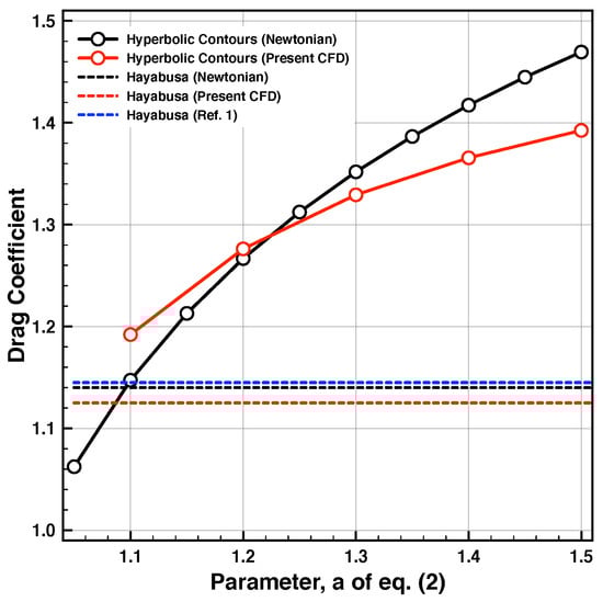 The aerodynamic characteristics are summarized in Figure 9. Figure 9a shows the comparison of the drag coefficients for hyperbolic contours. From this figure, it can be observed that the drag coefficients for all the hyperbolic contours are larger than that of the Hayabusa capsule at an AoA of 0 degrees. This result suggests that the drag coefficient can be increased using hyperbolic contours.