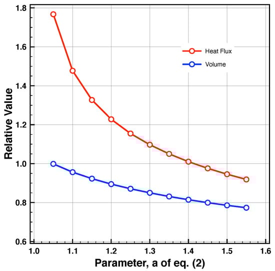 The shape of the capsule should be designed so that the payload must be stored inside the capsule. This means the larger volume inside the capsule should be better from the viewpoint of the payload. Additionally, as the parameter a increased the effective nose radius, , is also increased. The stagnation point heat flux changes depending on . This means the larger nose radius is better from the viewpoint of heat flux. Thus, the effect of the parameter a on the volume and heat flux was investigated. Figure 12 shows the relative values of the volume and the stagnation point heat flux for the capsules with hyperbolic contours. The volume is normalized by that of the Hayabusa capsule and the stagnation point heat flux is estimated by . From Figure 12, it can be observed that as the parameter a increases the volume of the capsule and the stagnation point heat flux decreases. This means that from the viewpoint of the volume the parameter a should be small. On the other hand, from the viewpoint of the stagnation point heat flux and the aerodynamic characteristics, the larger value of the parameter a is better. This suggests that the shape of the capsule with hyperbolic contours can be optimized by trading the aerodynamic characteristics, the stagnation point heat flux, and the volume of the capsule.