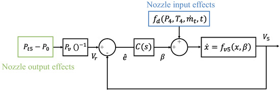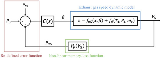The total pressure is related to the static P and dynamic pressure through: . If this relationship holds, combining the Wiener model of Figure 4 into the proposed control structure of Figure 3 yields the novel control structure of Figure 5. This scheme closes the exhaust gas velocity control loop through the constriction angle, while maintaining the effects of the turbojet operation configuration (i.e., ) as input disturbances. The advantage of this representation is that the controller can be designed using the exhaust gas velocity linear model (25) if adequate disturbance rejection and uncertainty specifications are considered. Note that the error function has now been re-defined to maintain a negative feedback and to suit the velocity-based control scheme, yielding: