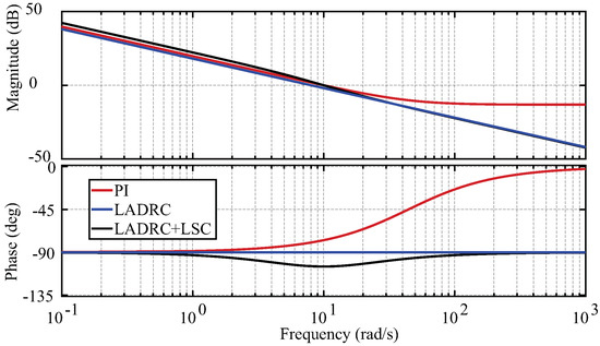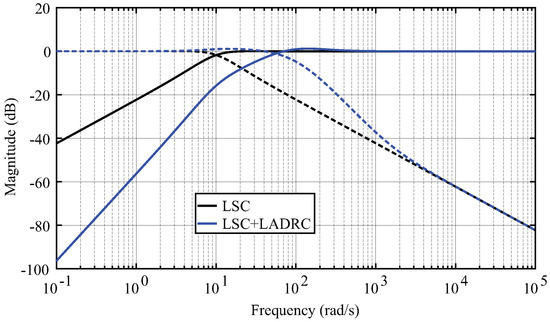 Equation (47) shows that LADRC is separable from any feedback controller if only the disturbance rejection element is used. Thus, the effects of the LADRC are only visible when considering the input disturbance and noise sensitivity functions.