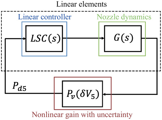 Equation (25) shows that the nozzle input/output dynamics depend mainly on . Thus, recalling Equation (20), for feedback control, the main sources of plant parametric uncertainty are: