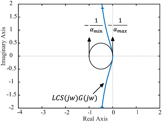 The transformed non-linear gain of Figure 15 lies within a sector that includes the effects of the linearization uncertainty. Thus, the linear elements of the autonomous system representation can be analyzed with sufficient stability conditions [31]. A practical test for asymptotic stability is the circle criterion, as presented in Figure 17. The Nyquist path for the linear elements (i.e., ) does not encircle nor touch the circle defined by and . This shows that the exhaust gas velocity loop is asymptotically stable for the analyzed operating range.