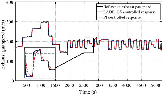 When considering the uncertainty caused by the linearization, the resulting LSC + LADRC can maintain the desired performance properties, while classical controllers struggle when handling the nozzle non-linear dynamics. This is shown in Figure 18, where the PI controller provides a slower response when compared to the the LSC + LADRC, which follows more closely the desired exhaust gas speed. It should be noted that the differences among both control schemes (i.e., PI and LSC + LADRC) are reduced if the linear engine model is used for the simulation. This shows that the improvements observed in the LSC + LADRC scheme are due to it successfully rejecting engine non-linearities.
