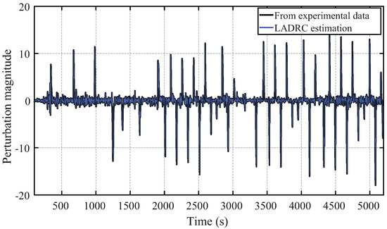 On the other hand, the ESO designed of the LADRC scheme effectively estimates the disturbances caused by the turbojet thermal state changes (i.e., throttle setting changes). This is shown in Figure 19, where the estimation closely follows the input disturbance . This disturbance is caused by changes in the aeroengine thermal state. That is, when the fuel flow is increased or decreased, the corresponding changes in the gas path variables ( and ) and mass flow affect the nozzle input gas speed. The combination of the effects of each individual variable into the nozzle input gas speed are encompassed in the disturbance .