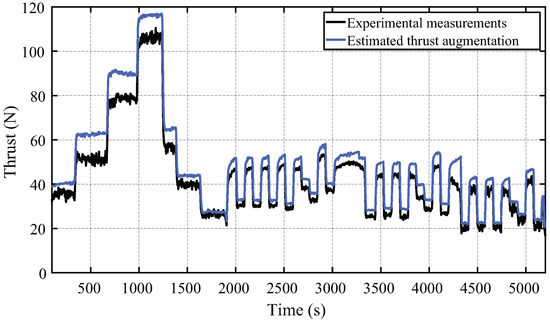 After optimally expanding the exhaust gas it is expected for the turbojet to provide an increased thrust with the same throttle settings. This result is confirmed in Figure 20, which shows the estimated thrust with the proposed control scheme in comparison with the measurements using a fixed nozzle turbojet. The thrust is estimated to increase up to 20 %. For the whole experiment considering different maneuvers and throttle settings, the average percentile augmented thrust is 14.41%. This thrust augmentation can provide major improvements for the turbojet fuel economy.