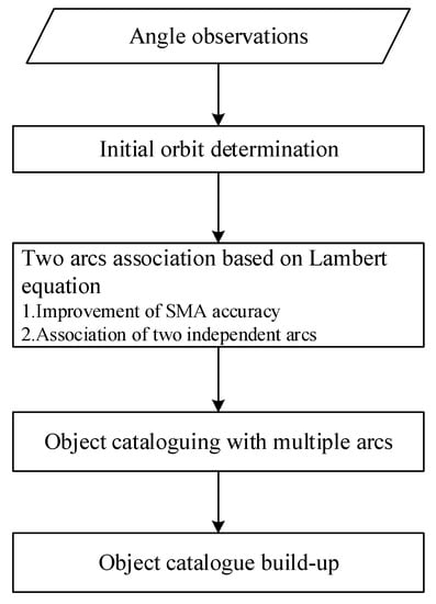 The general procedure (Figure 1) to associate two short arcs involves, first, the IOD of each arc, and then the determination of the correlation of the two IOD orbit element sets. That is, the orbit elements are the basis for autonomous association of orbit arcs, and high-precision orbit elements would be useful for reliable association and subsequent orbit improvement. In addition, the accurate IOD may be essential for fast object identification, maneuver detection, short-term orbit prediction, and so on. For GEO objects, space-based optical surveillance may only generate an arc as short as a few minutes.