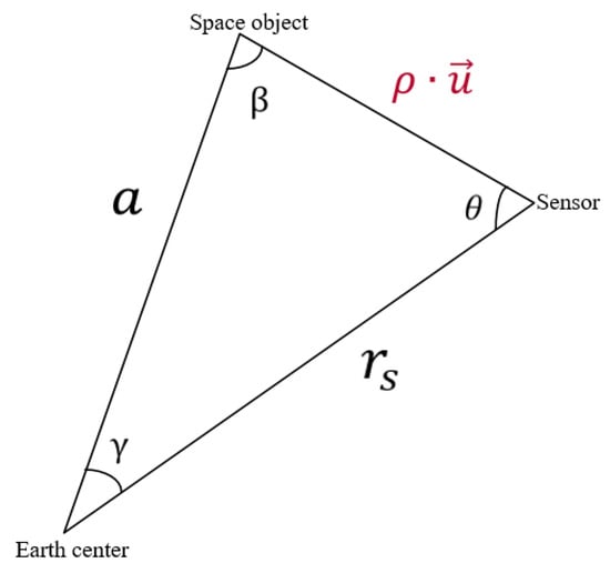Equation (1) holds or nearly holds if the SMA is close to its truth. However, the SMA is unknown and to be determined. Without the range information, the angles at two epochs are insufficient to solve the SMA. With the zero-eccentricity assumption, if the SMA, which is the same as the radius of the orbit, is given, then and (and thus the other orbit elements) can then be computed, because the ranges between the sensor and object at the observation epochs can be determined from the assumed SMA, as well as the known position of the sensor and angles from the sensor to the object at the epochs, as shown in Figure 2. According to Figure 2, the formulae to compute the range between the sensor and object are as follows: