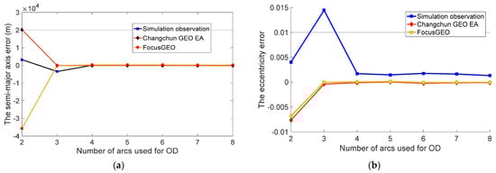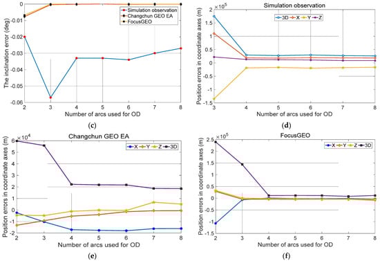 Figure 5 shows the accuracy improvement of the estimated SMA (a), eccentricity (b), inclination (c), and three-dimensional position (d, e and f) when the number of used arcs increases in the autonomous cataloguing of GEO objects with the observations observed by the simulated space-based sensor, the Changchun GEO EA, and the SAO FocusGEO, respectively. It is seen that when 4 or more arcs are processed, the errors of the three orbit elements are all close to zero, and the 3D (three-dimensional) position errors are stable at about 25–30 km.